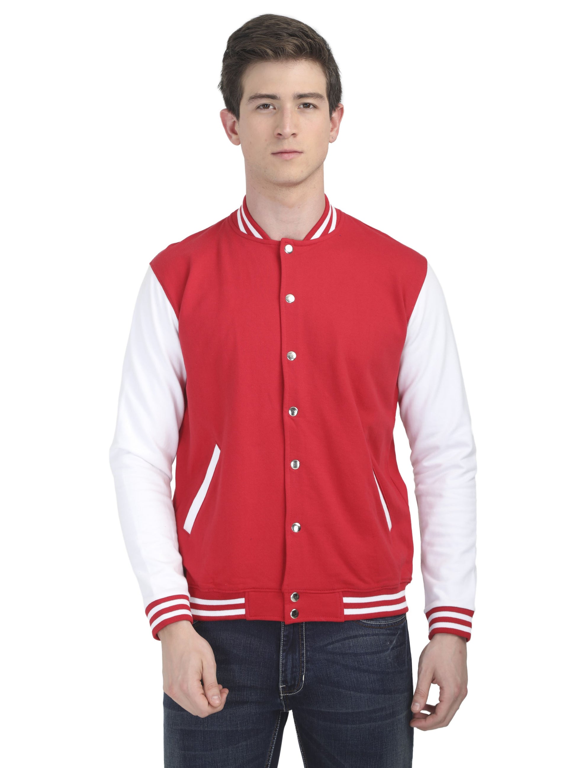 The ATMOS Varsity Jacket blends timeless collegiate style with modern comfort. Crafted from 100% cotton fleece and finished with signature varsity rib stripes, it offers warmth, durability, and effortless style. The 400 GSM fabric ensures a rich hand-feel, while the snap-button closure and slanted welt pockets add everyday functionality. Perfect for team uniforms, college wear, or brand merchandising.